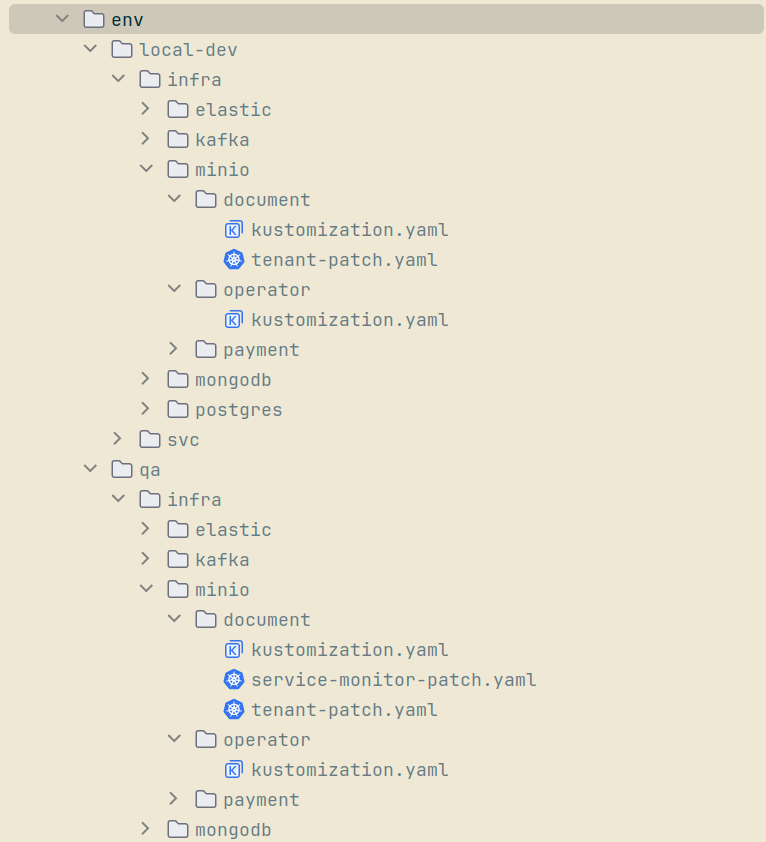 In both environments, Operator manifests and Kustomize overlays reside side by side in well-organized